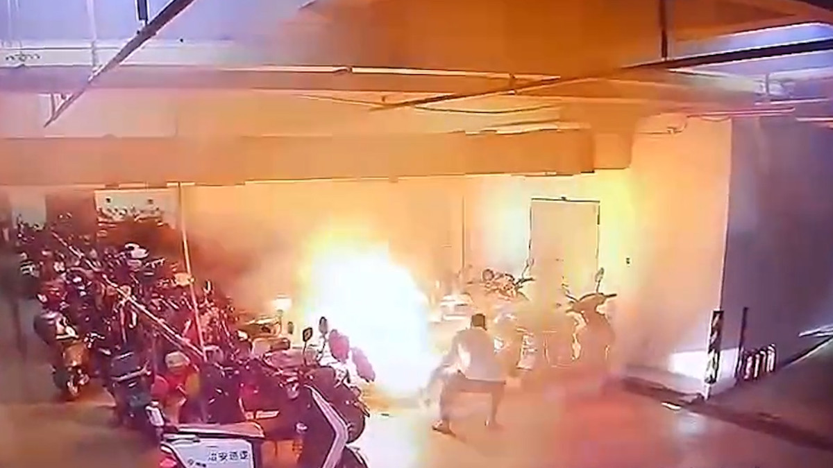 Phát hiện xe máy bốc cháy dữ dội tại khu vực đỗ xe ở Hải Nam, Trung Quốc, nhân viên bảo vệ dũng cảm nhanh chóng kéo chiếc xe ra ngoài.