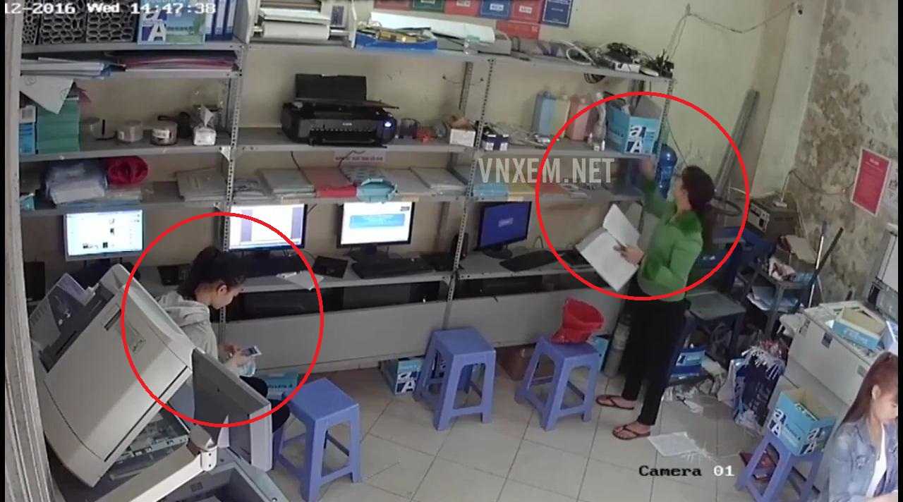 17/12/2016 11:21:00 +07:00Nữ nhân viên của cửa hàng photocopy mải mê bấm điện thoại, không để ý chiếc ví đỏ trên nắp thùng giấy đã 'không cánh mà bay' vào túi 'nữ quái'.