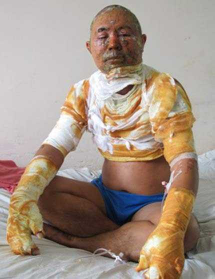 Theo bác sĩ Trần Đoàn Đạo (Trường Khoa Phỏng Bệnh viện Chợ Rẫy), anh Nghiệp nhập viện trong tình trạng bỏng nông ở mặt, bụng, mắt và hai cánh tay.