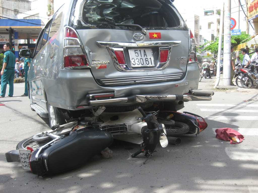 Tuy nhiên, chiếc xe lùi với tốc độ cao, lao qua bên kia đường và tông trúng xe máy BKS 51H5-7636 và BKS 54H3-5255 rồi cuốn cả hai xe máy vào gầm.