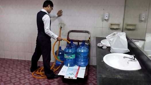 | Nhân viên sân bay lấy nước từ toilet cho vào bình nước khoáng. |
