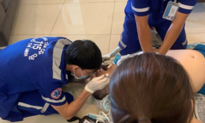 Trên xe cứu thương, bệnh nhân được truyền dịch và bóp bóng giúp thở. Đôi lúc, tim người bệnh lại ngưng đập. Bác sĩ Hương ép tim khoảng vài phút, tim mới đập trở lại.