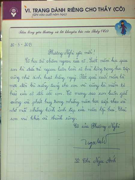 Chấp bút ngày 20-5, cô Lê Thị Ngọc Ánh, giáo viên lớp 2/4 Trường Tiểu học Nguyễn Đức Cảnh, phường 14, quận 5, TP.HCM, viết: “Phương Nghi yêu mến! Cô học trò chăm ngoan của cô.