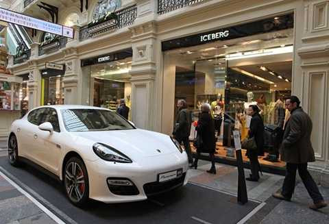 | Khách hàng ngắm nhìn chiếc Porsche Panamera trưng bày ở Moscow. |