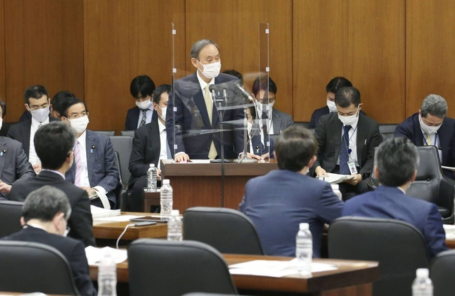 Thủ tướng Yoshihide Suga phát biểu trong phiên họp tại Hạ viện ngày 23/4. Ảm: Kyodo.