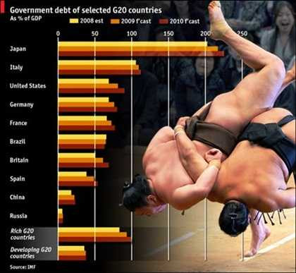Nhật Bản hiện nay có mức nợ cực cao. Đến năm 2014, số nợ của Nhật Bản sẽ lên đến 245% GDP. Để so sánh, năm 1984 số nợ này chỉ chiếm có 67,3% GDP.