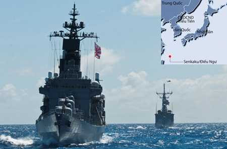 | Tàu chiến Nhật, Mỹ trong một cuộc tập trận chung và vị trí nhóm đảo Senkaku/Điếu Ngư (ảnh nhỏ) - Ảnh: Navy.mil - Đồ họa: báo Thanh Niên |