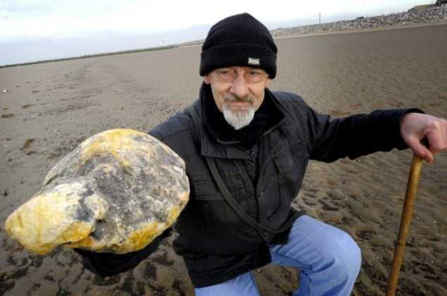 Ken Wilman, tên người đàn ông may mắn và chú chó của anh là Madge đang đi dạo trên bờ biển Morecambe và tình cờ phát hiện ra hòn đá lạ này. Tuy nhiên, lúc đó Ken đã kéo chú chó của mình về nhà vì mùi khá khó chịu của tảng đá vàng này.
