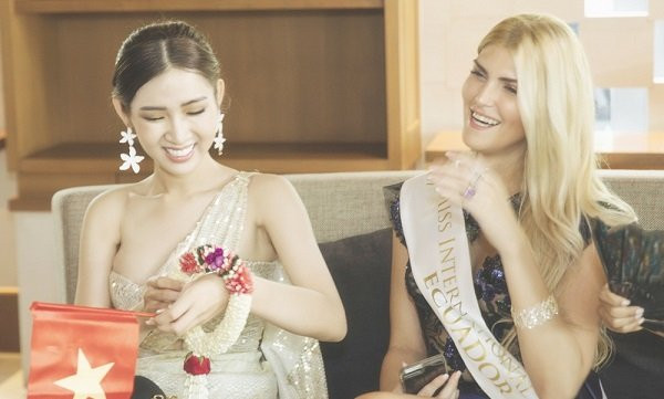 Cô vui vẻ chụp ảnh, trò chuyện cùng các thí sinh khác và luôn cầm trên tay lá cờ Việt Nam nhỏ.