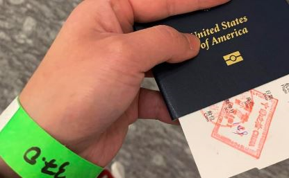 Nhân viên Đại sứ quán Mỹ kiểm tra thân nhiệt của tôi và cho tôi một dải băng đeo tay màu xanh lá. Màu này biểu thị cho chuyến bay tôi sẽ lên. Một chuyến bay tới Mỹ khác cũng sẽ cất cánh, và người trên chuyến bay đó đeo ruy băng tay vàng.