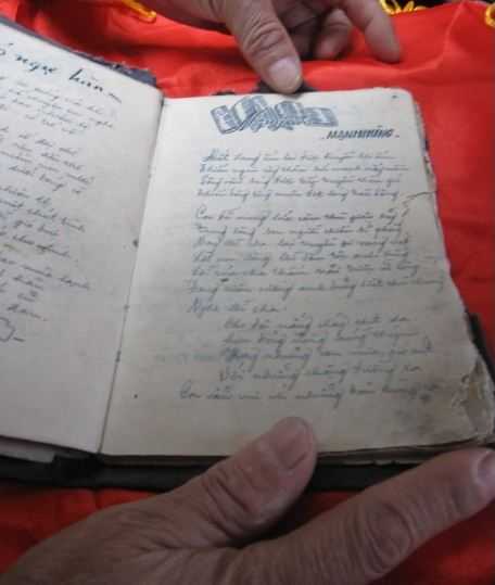 | Cha già nâng niu từng trang viết đã hoen màu trên cuốn nhật ký. Ảnh: Nhắn tìm đồng đội. |