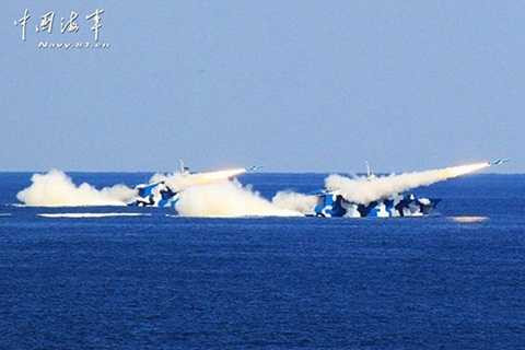 | Hải quân Trung Quốc tập trận bắn đạn thật trên biển - Ảnh: Chinamil |