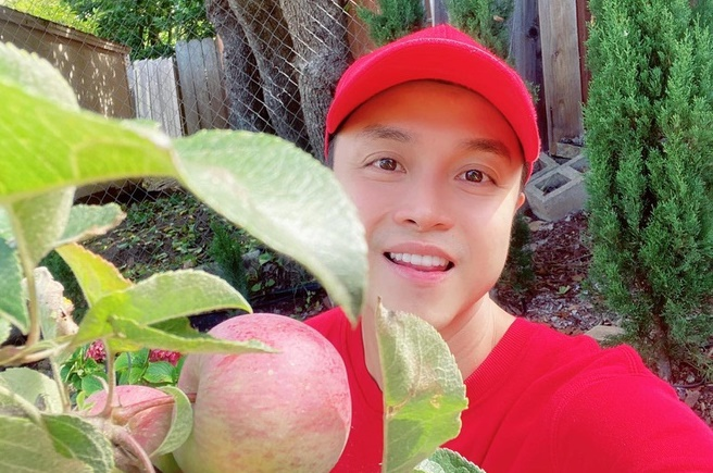 Nam ca sĩ khoe trái cây trong vườn nhà.