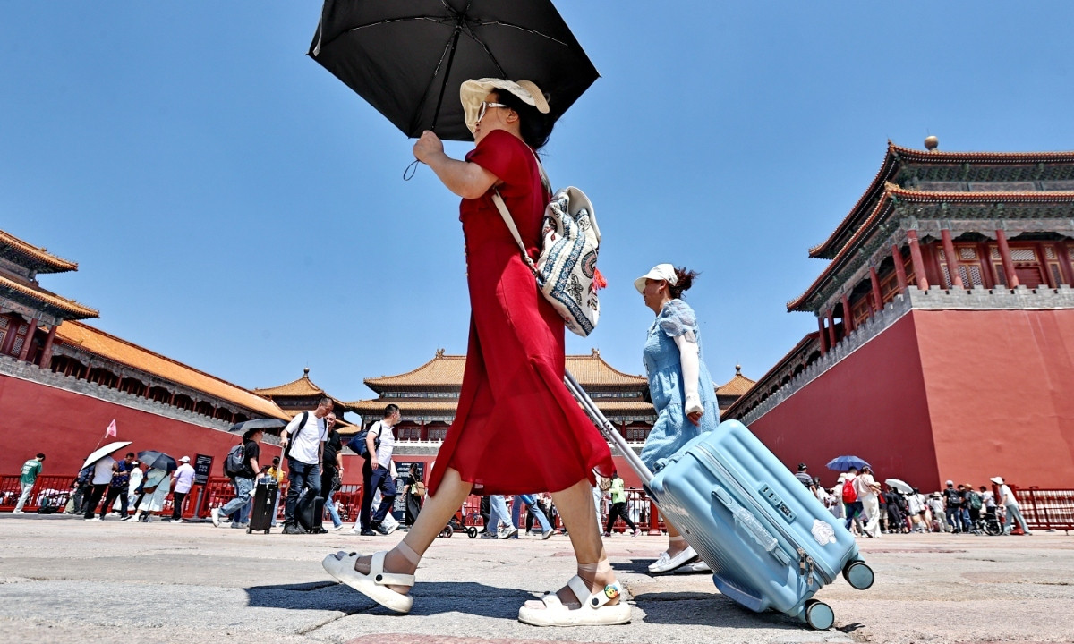 Du khách đi trong trời nắng gắt tại Cố Cung, Bắc Kinh ngày 17/5. (Ảnh: IC)