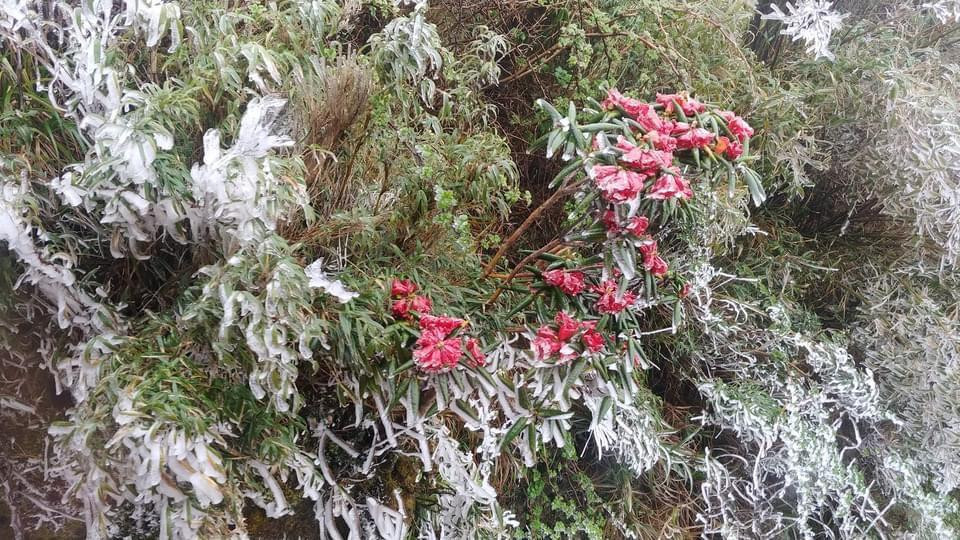 Băng giá phủ trắng cây cối trên đỉnh Fansipan sáng 2/4.