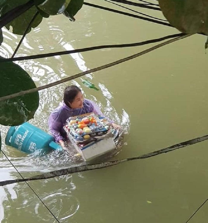 Một phụ nữ ở TP Hà Tĩnh mang theo "phao cứu sinh" là vỏ bình gas lội nước đi mua lương thực thực phẩm