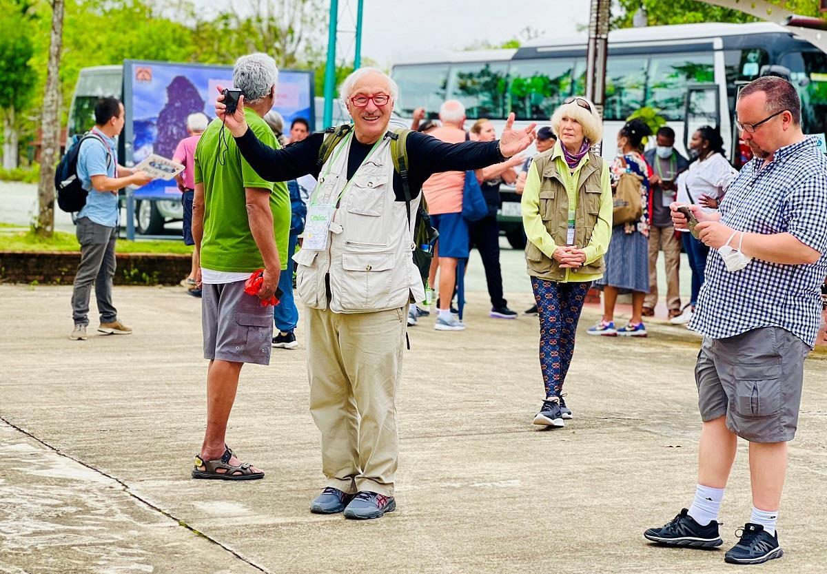 Du khách quốc tế háo hức khi tham quan khu đền tháp Mỹ Sơn trong sáng 9/4. (Ảnh: Thanh Ba)