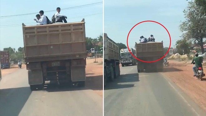Nhiều học sinh mạo hiểm ngồi trên xe ben đến trường