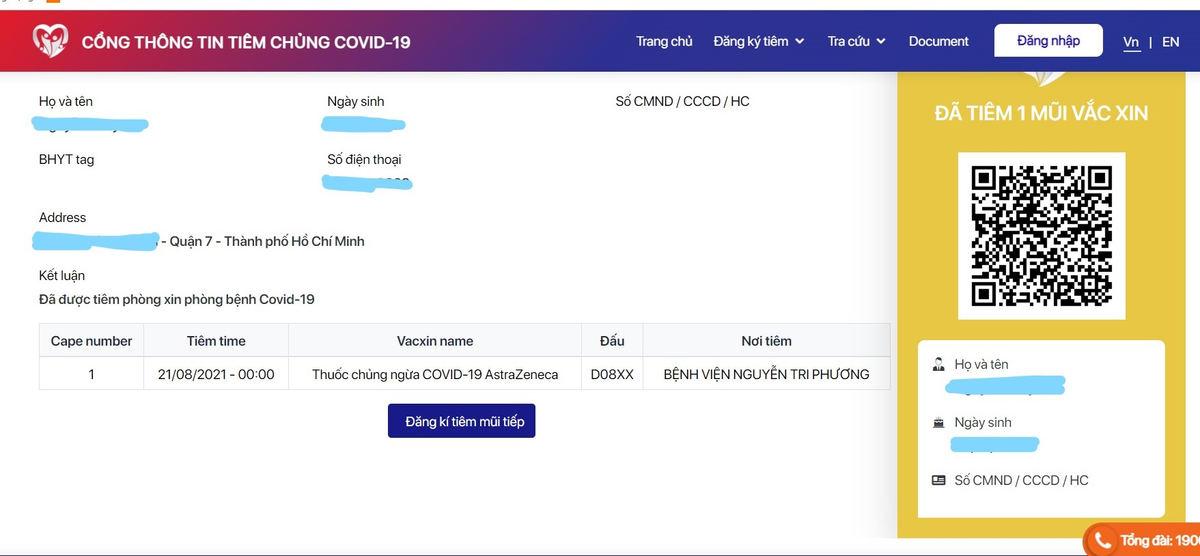 Theo chị M., mũi 1 chị tiêm tại Nhà thi đấu Phú Thọ (TP.HCM) ngày 29/6, mũi 2 tiêm tại Bệnh viện Nguyễn Tri Phương ngày 21/8. Nhưng trên Cổng thông tin tiêm chủng COVID-19 chỉ cập nhật 1 mũi tiêm tại Bệnh viện Nguyễn Tri Phương ngày 21/8.