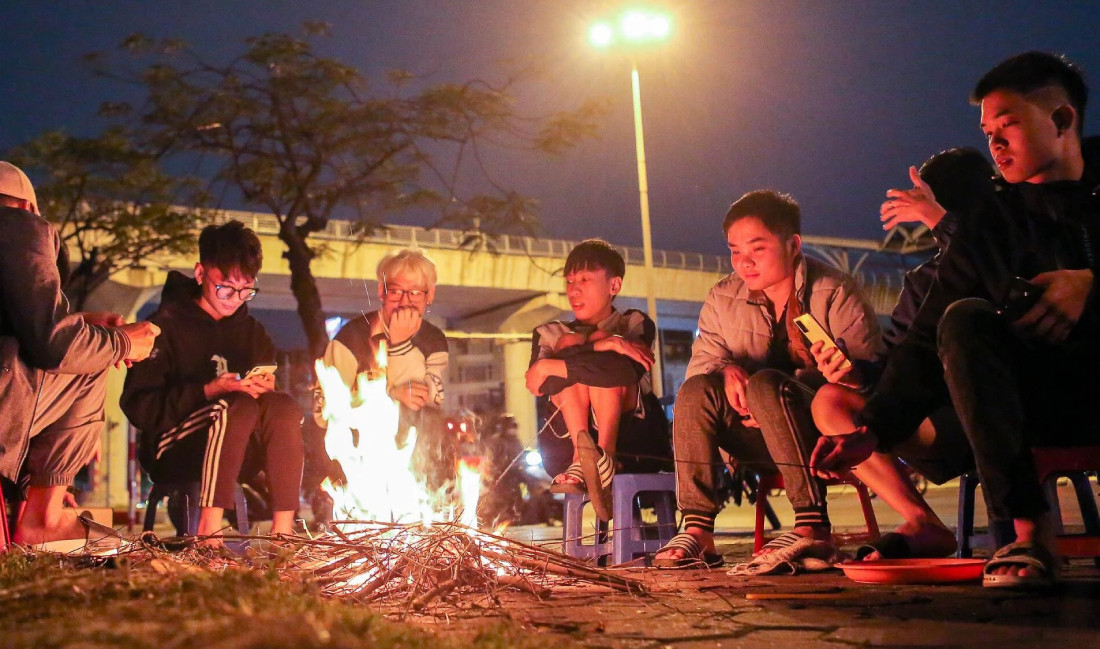 Người nhà bệnh nhân trùm áo mưa, quấn chăn chống rét ở BV Bạch Mai.