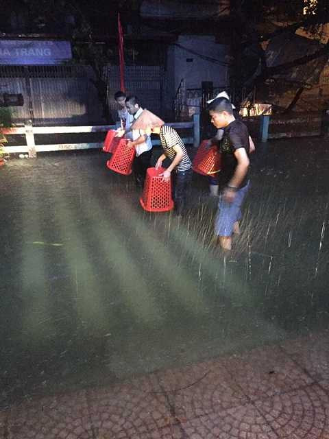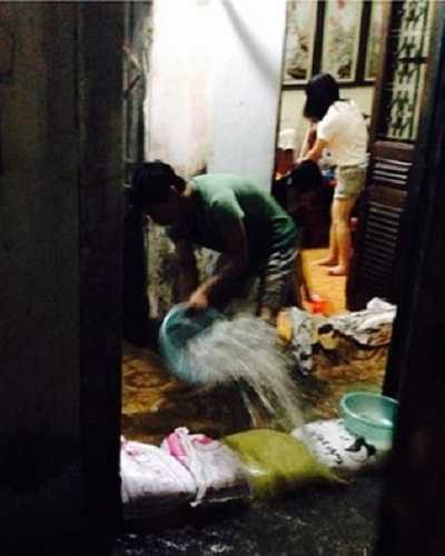 Nhiều khu dân cư nước ngập vào cả vào nhà dân, đồ đạc trôi nổi bồng bềnh. Trước tình trạng này, người dân phải lấy bao cát chắn không cho nước tràn vào nhà và dùng chậu tát nước từ trong ra để tránh ngập sâu.