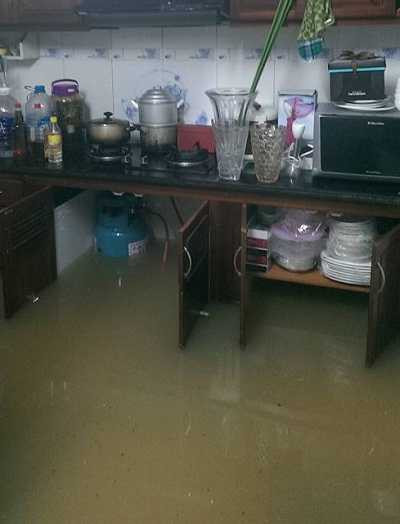 | Những người ngủ dậy mới biết thì nước đã ngập đến thành giường, đồ đạc trong phòng trôi nổi trên mặt nước. Ổ điện chìm trong nước rất nguy hiểm. Ảnh: Otofun |