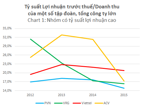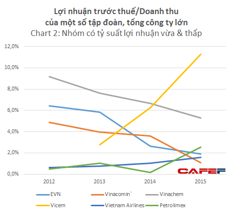 Số liệu do CafeF tổng hợp từ các báo cáo tài chính được công bố công khai cho thấy tỷ suất lợi nhuận trên doanh thu của nhiều doanh nghiệp lớn đã giảm liên tục trong 2-3 năm gần đây như Tập đoàn Cao su (VRG), Tập đoàn Dầu khí (PVN), Tổng Công ty Cảng hàng không (ACV), Tập đoàn Hóa chất (Vinachem), Tập đoàn Điện lực (EVN), Tập đoàn Than khoáng sản (Vinacomin).