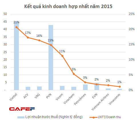 Năm 2015, Vinacomin đạt doanh thu gần 76.400 tỷ đồng nhưng chỉ lãi trước thuế 840 tỷ đồng. Tương tự, Vietnam Airlines đạt doanh thu 66.000 tỷ nhưng chỉ lãi hơn 1.000 tỷ đồng.