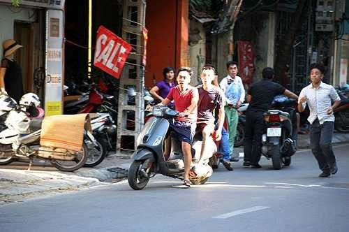 Trong dòng phương tiện đông đúc chờ đèn tín hiệu tại nút giao Bạch Mai - Đại Cồ Việt, hai thanh niên đội mũ lưỡi trai, đi xe Liberty tỏ ra rất nổi bật.