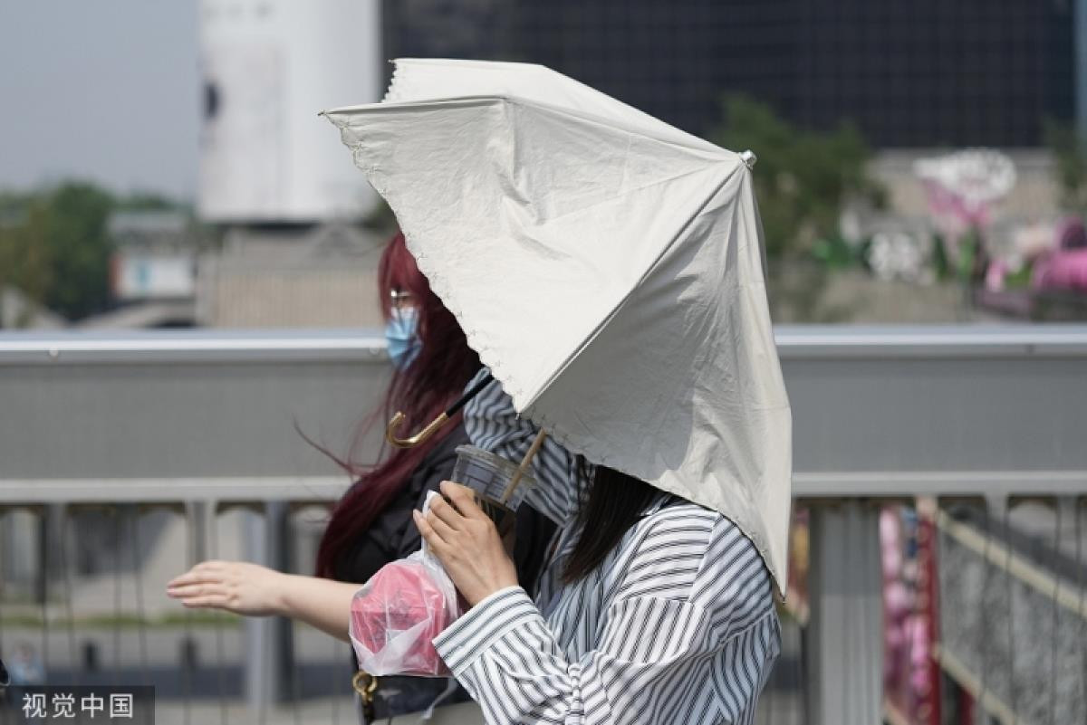 Bắc Kinh phát đi cảnh báo nhiệt độ cao màu xanh. Người dân che ô khi di chuyển ngày 15/5. (Ảnh: Chinanews)