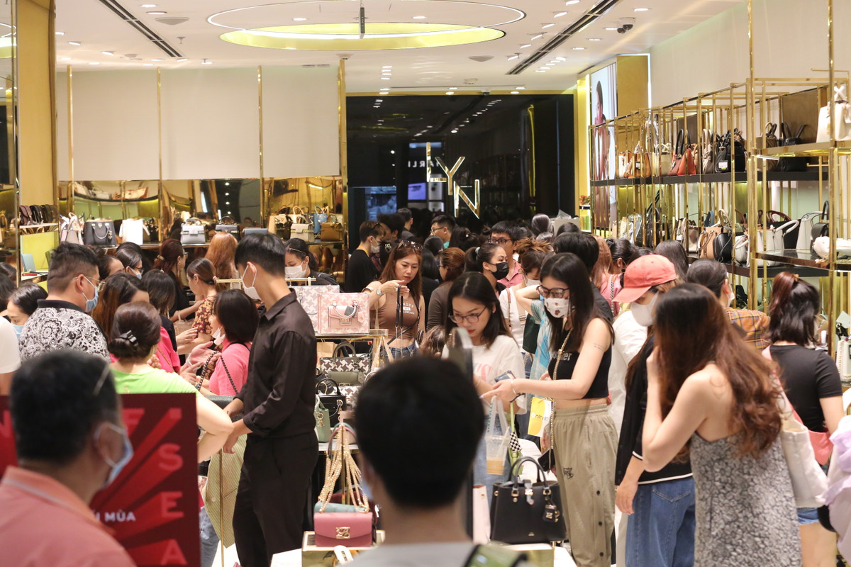 Cảnh đông nghịt tại một cửa hàng túi xách trong trung tâm thương mại ở TP Thủ Đức.
