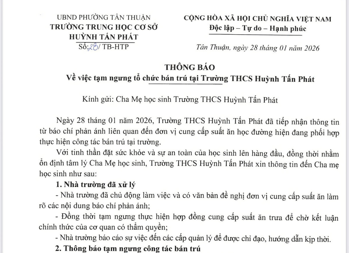 Trường THCS Huỳnh Tấn Phát ngày 28/1 đã ra thông báo về việc ngưng tổ chức bán trú tại trường kể từ ngày 29/1 cho đến khi có thông báo mới.