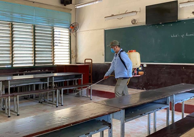 Trường THPT Võ Thị Sáu (Vĩnh Phúc) phun thuốc khử trùng các phòng học trong thời gian học sinh nghỉ. (Ảnh: Sở GD&ĐT Vĩnh Phúc)