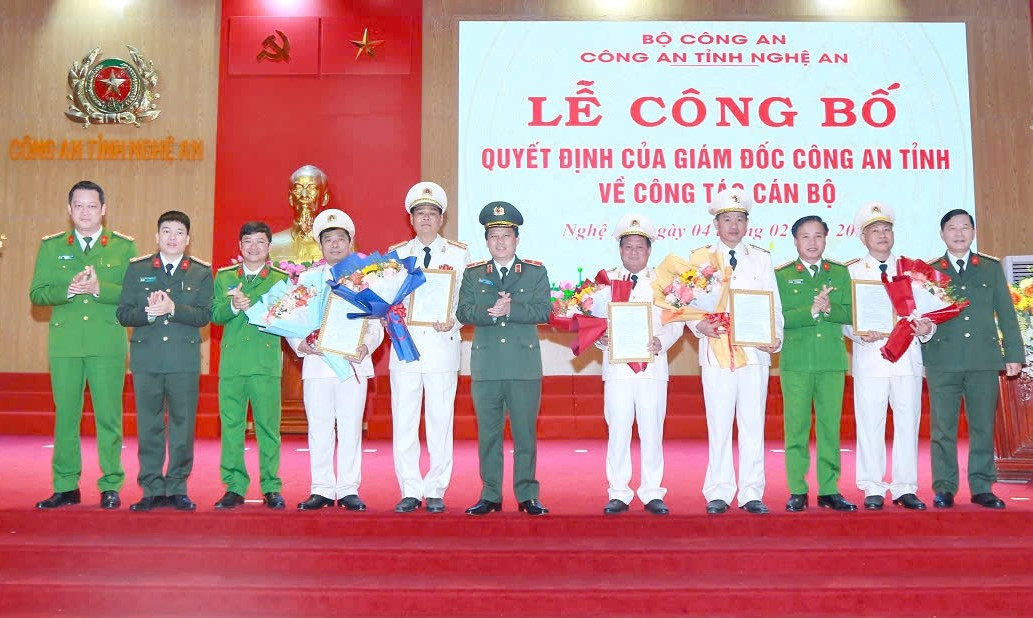 Ngày 4/2, Công an tỉnh Nghệ An tổ chức Lễ công bố các quyết định nghỉ công tác, chờ hưởng chế độ hưu trí đối với 5 trưởng phòng, trưởng công an cấp huyện và giao phụ trách đơn vị đối với 5 lãnh đạo cấp phó.