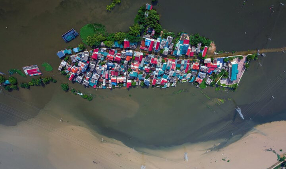 Xóm Bến Vôi, thôn Cấn Hạ (xã Cấn Hữu, huyện Quốc Oai, Hà Nội) chìm trong biển nước như một ốc đảo mấy ngày qua do Thủy điện Hòa Bình mở 4 cửa xả đáy. (Ảnh: Phạm Quốc Dũng)
