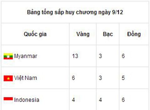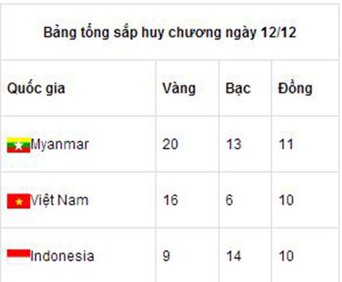 6 HCV trong ngày thi đấu 13/12 nhưng Việt Nam đã bị Indonesia và Thái Lan bám sát. Một ngày thi đấu tiêu biểu cho câu nói "chúng ta tốt nhưng đối phương còn tốt hơn". Mặc dù vậy, Việt Nam vẫn giữ được vị trí thứ 2 với 22 HCV, kém Myanmar 4 HCV.