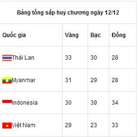 Lần đầu tiên kể từ khi chen chân vào top 3, chúng ta bị bật ra khỏi top 3. Chúng ta liên tiếp bị Thái Lan và Indonesia vượt mặt, trong khi khoảng cách với Myanmar vẫn không bị san lấp. Đây cũng là ngày thi đấu đầu tiên, đoàn VĐV đến từ xứ chùa vàng dẫn đầu SEA Games 27.