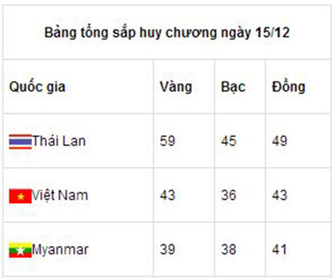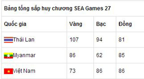3 chiếc HCV của đội taekwondo cũng chỉ giúp Việt Nam giữ được vị trí thứ 2, nhưng khoảng cách giữa chúng ta và Myanmar chỉ còn là 1 chiếc HCV (54 so với 53). Trong khi đó, ở vị trí dẫn đầu, Thái Lan tiếp tục băng băng trên con đường giành 100 HCV ở SEA Games 27 khi đã có chiếc HCV thứ 73.