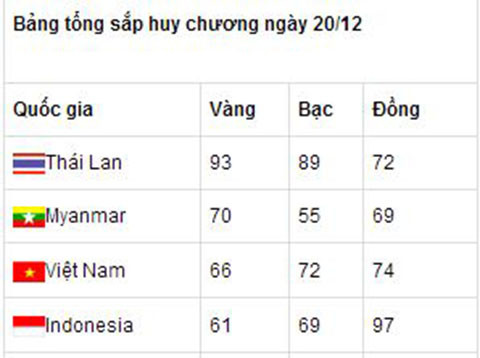 Sau ngày vàng rực rỡ 19/12, Việt Nam lại xuống dốc khá rõ ở ngày thi đấu sau đó. Chúng ta bị xử ép ở rất nhiều nội dung thi đấu, đặc biệt là ở các môn võ. Vị trí thứ 2 trên bảng tổng sắp cũng bị Myanmar lấy mất. Cơ hội của chúng ta chỉ còn là bảo vệ vững chắc vị trí thứ 3, với 5 HCV nhiều hơn Indonesia.