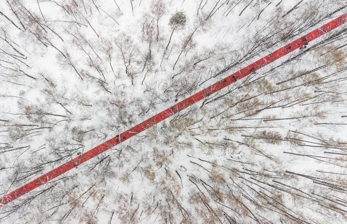 Người dân đi bộ trên một tác phẩm nghệ thuật sắp đặt có tên là "Nowhere" của Gregory Orekhov tại công viên Malevich thuộc làng Razdory bên ngoài Moscow, Nga.