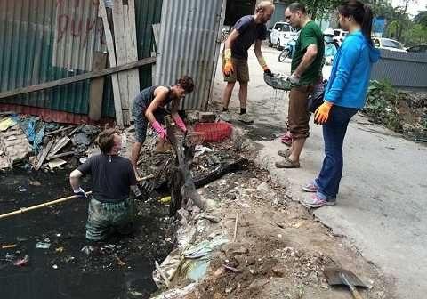 | Nhóm người nước ngoài cùng các bạn học sinh, sinh viên Việt Nam đang moi rác trong cống ra. |
