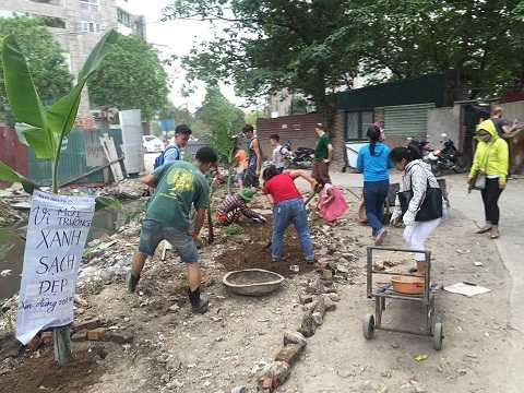Vào thời điểm trên, một nhóm người nước ngoài cùng các em sinh viên, học sinh Việt Nam đang lội xuống cống thải đen ngòm để dọn sạch rác đoạn cuối ngõ 381/55/4 Nguyễn Khang (Hà Nội).