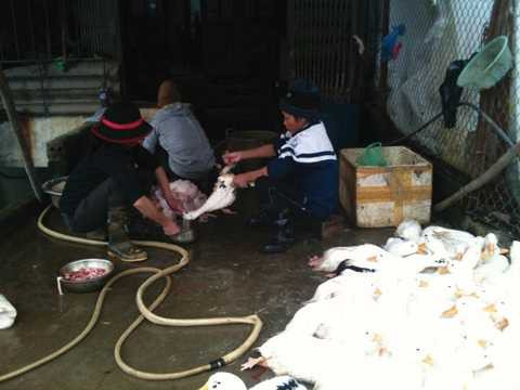 | Vịt sống, vịt đã vặt lông nằm lăn lóc, lẫn lộn giữa sân. Ảnh: Lao động. |