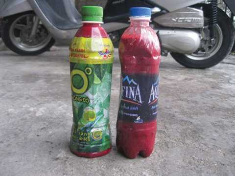 | Tiết canh bẩn đóng chai, chờ mang đi bán. |
