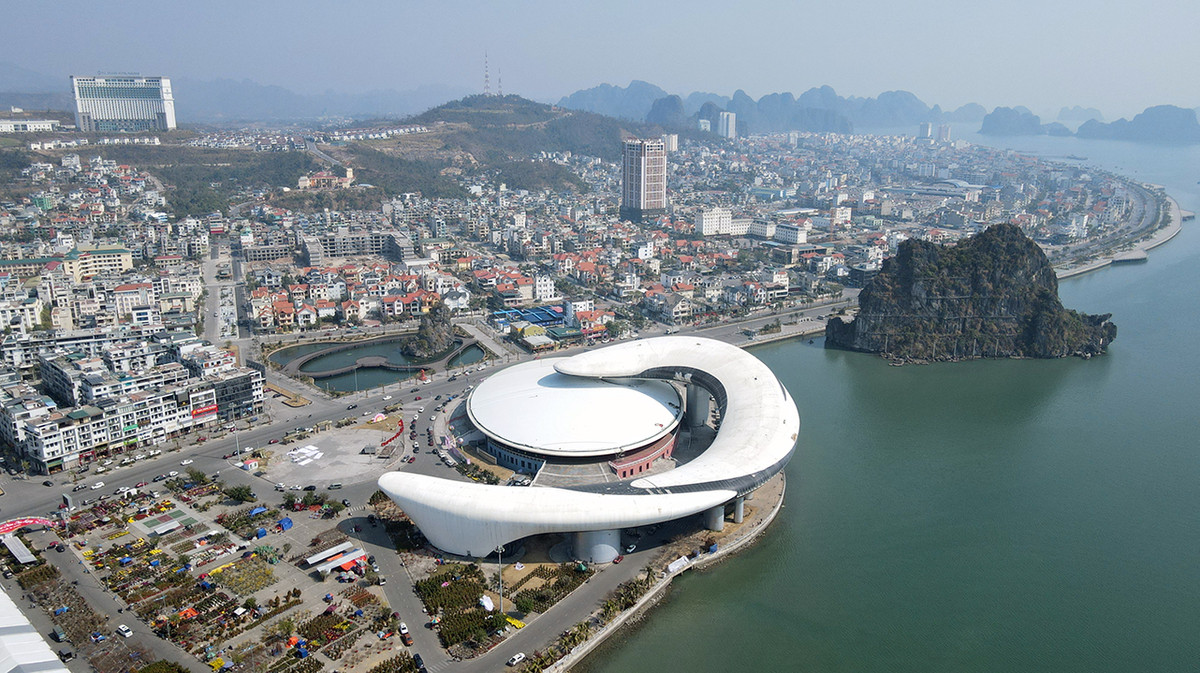 Với hình dáng như một chú cá heo đang vờn sóng, công trình hiển hiện bên bờ di sản, kỳ quan thiên nhiên thế giới vịnh Hạ Long.