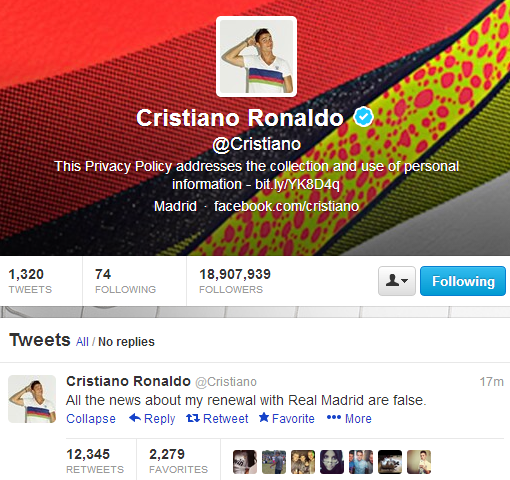 Đến ngày hôm, thông qua Twitter và Facebook, Ronaldo tuyên bố: “Tất cả những thông tin về việc tôi sẽ gia hạn hợp đồng với Real là hoàn toàn sai lệch.”