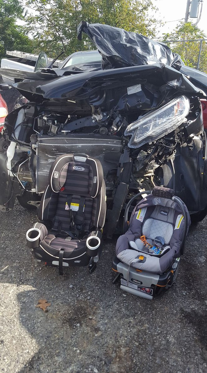 Trong ảnh, có thể thấy chiếc xe hơi bị đâm nát phần đầu rất khủng khiếp. Tuy nhiên, hai chiếc xe nôi vẫn nguyên vẹn, không có vẻ gì là bị ảnh hưởng bởi tai nạn thảm khốc trước đó.