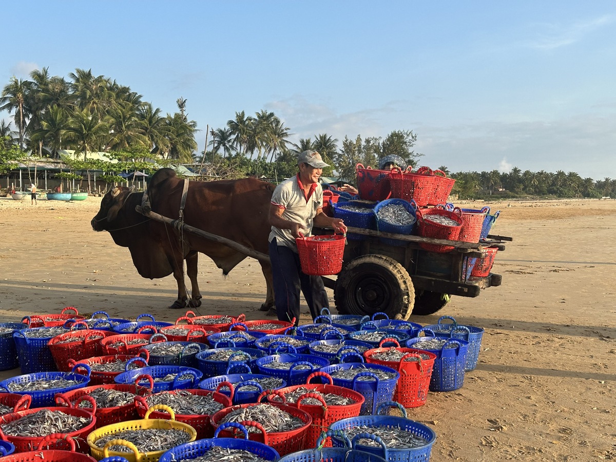 Ông đã gắn bó với công việc này hơn 20 năm. Theo ông Vương, đặc thù bãi biển nơi đây là nền đất lún, mỗi phi cá cơm nặng trên 200kg nên không thể dùng sức người khiêng vác. Các phương tiện thô sơ cũng dễ bị sa lầy, vì vậy người dân nghĩ ra cách dùng bò kéo để vận chuyển.