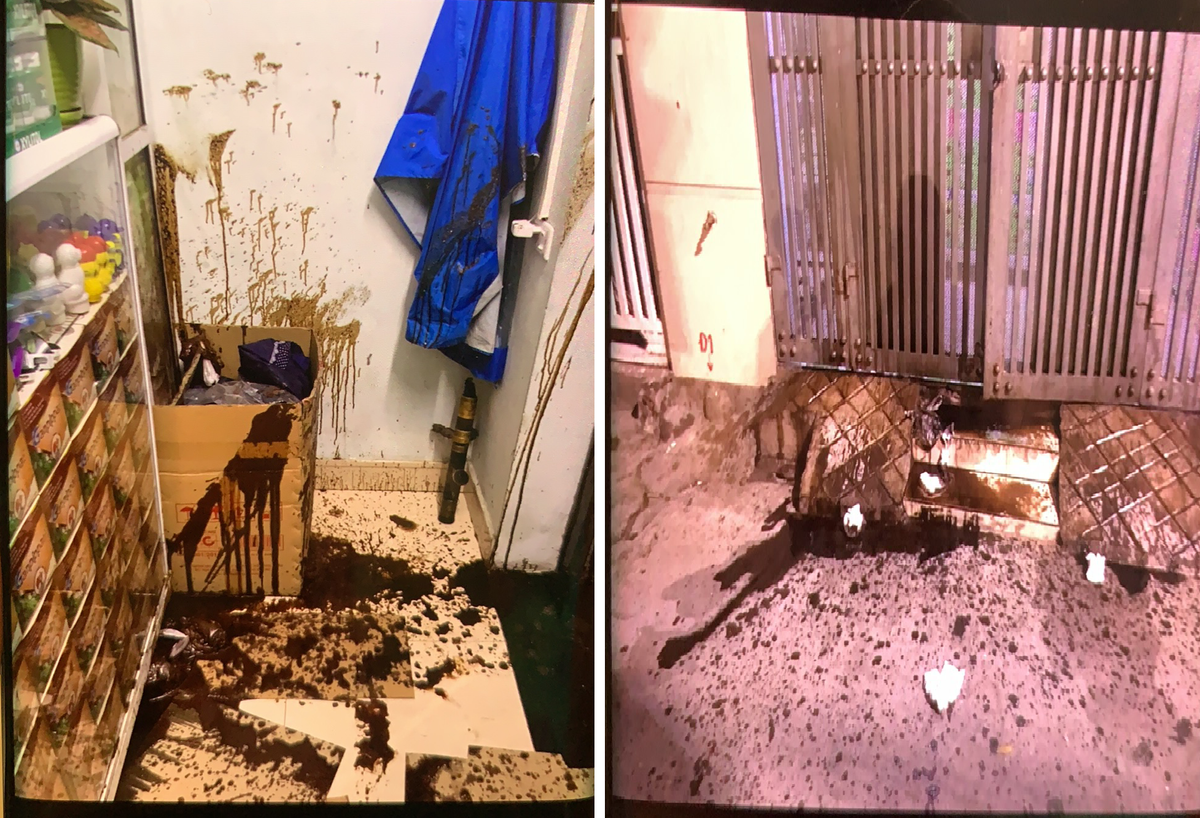 Hình ảnh nhóm côn đồ ném dầu luyn, mắm tôm vào hiệu thuốc của anh Bằng.