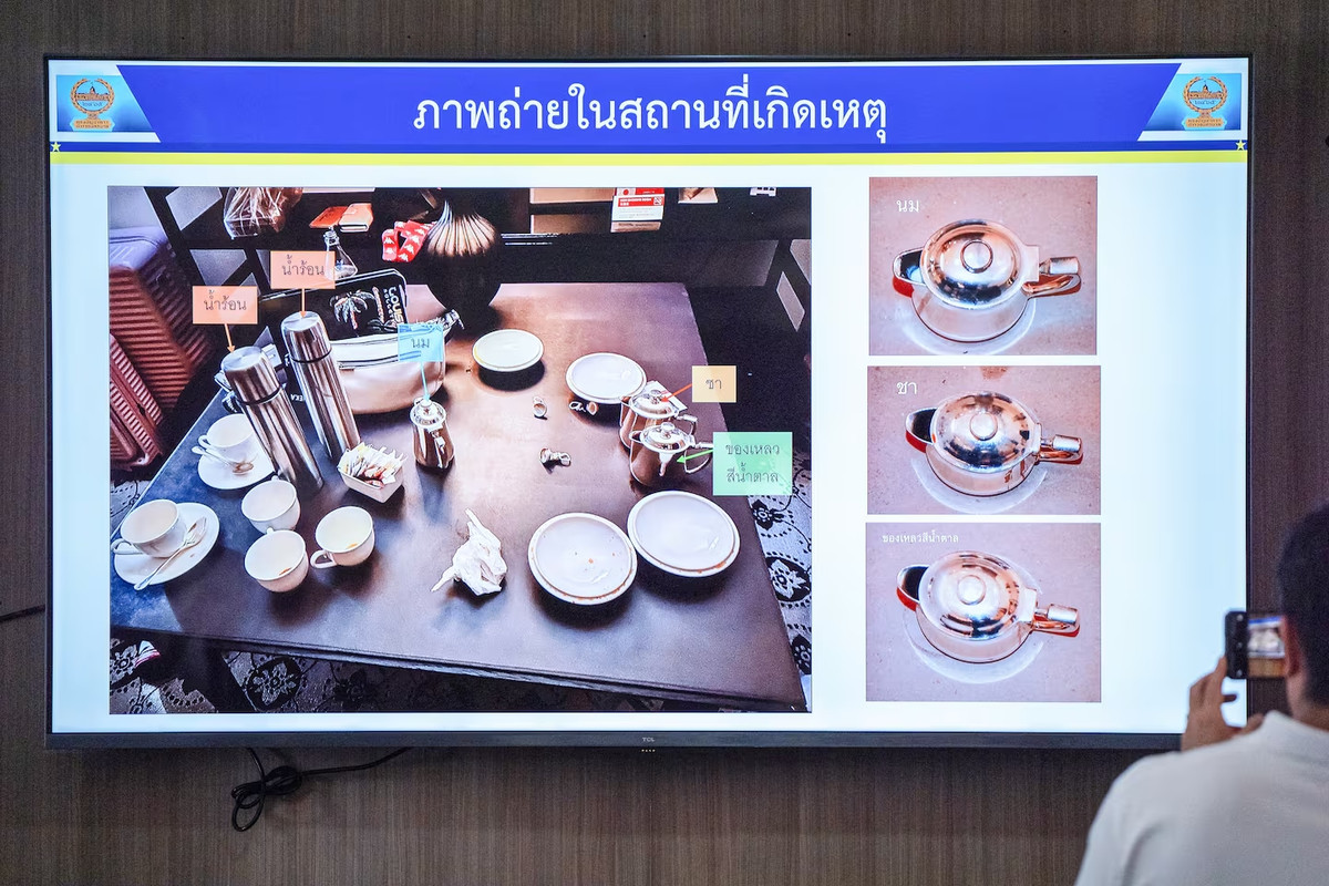 Trung tướng Trairong Phiewphan - Trưởng bộ phận khoa học pháp y cảnh sát Thái Lan cho biết, xyanua cũng được tìm thấy trong các túi trà thu thập được từ căn phòng đó.
